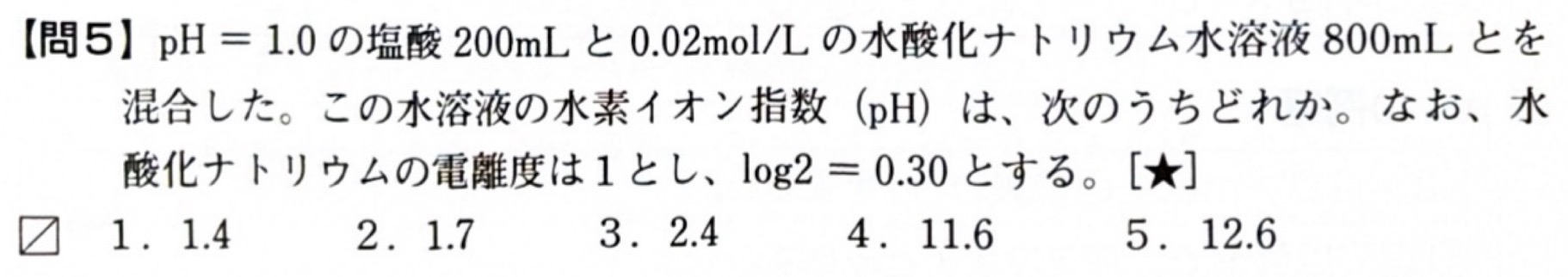 次は同じく物理・化学の問題でシンプルなpHの問題です。