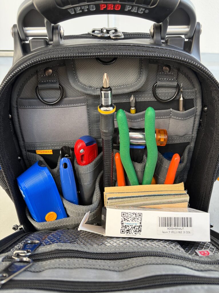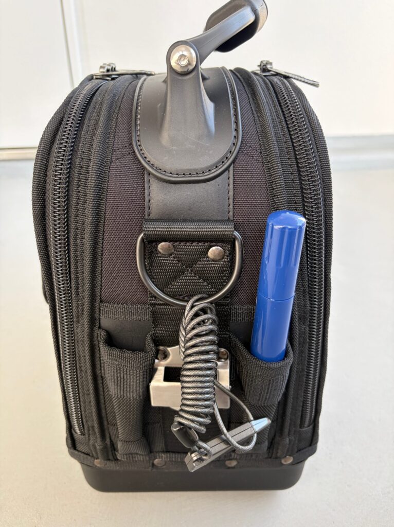 写真を見ると、工具を満載にした状態でもバッグが型崩れせず、ハンドルで片手持ちできる形状を保っているのがわかる。さらに堅牢なショルダーベルトが付属しているため、肩にかけることもできる。ショルダーがけにすれば両手が空くので、もう一方の手に別の荷材や部品を持ちながら移動できる。これが思った以上に実用的で、毎日の業務をラクにしてくれる機能だ。