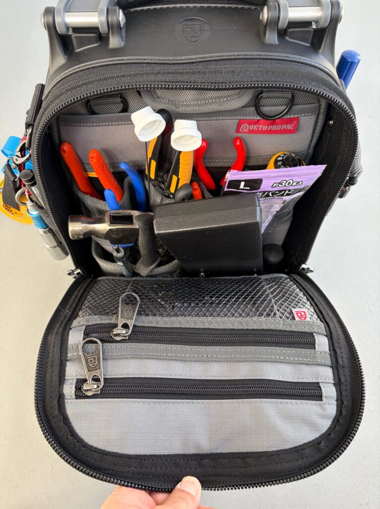 実際に開けてみると、前面コンパートメントには電工ペンチ、圧着工具、カッター、ドライバー類がきれいに立てて収納されている。上部にはビット類を差せる細かいポケットが並んでおり、小さな工具も迷子にならない。さらに下部には独立したジッパーポケットがあり、書類や小物の収納にも対応している。