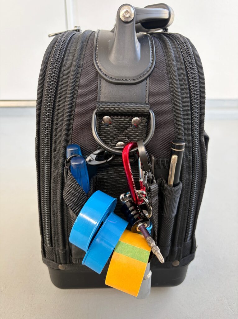 バッグ本体の側面には頑丈なDリングが装備されており、カラビナを使って小物や消耗品を外側に吊るすことができる。写真では養生テープ、マスキングテープ、ビットなどを取り付けており、頻繁に使うものはここに集約している。バッグを開けるまでもなくサッと取り出せるので便利だ。