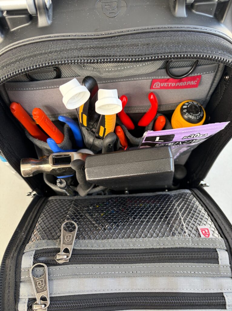 前面に加えて、メインコンパートメントにも驚くほどの工具が収納できる。写真のとおり、ペンチ各種(圧着・ニッパー・ラジオペンチ)、ハンマー、デジタルテスター、結束バンドのストック、各種ドライバーと、これだけの量が整然と立てて収まっている。